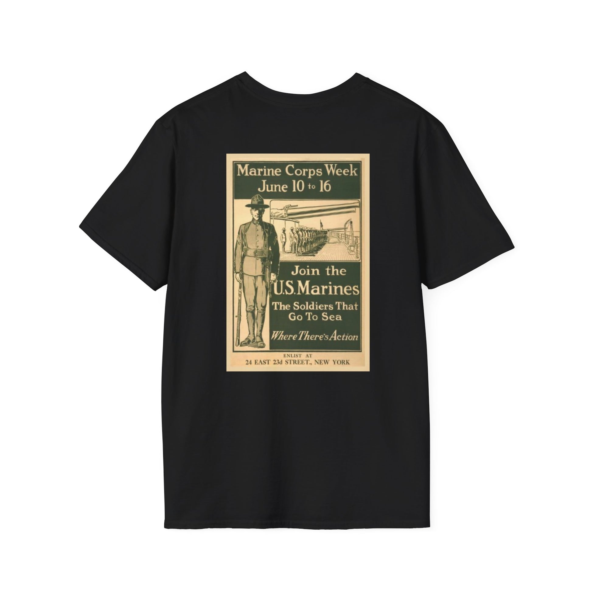 The back features a vintage USMC recruiting poster pulled from another era of service. The front is kept minimal with the 1st Marine Division insignia. No slogans. No reinterpretation. Just history and intent.